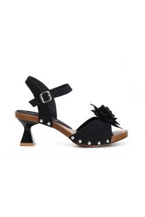 Suede sandals with 3d flower and ankle strap. hourglass heel in the same colour as the strap.