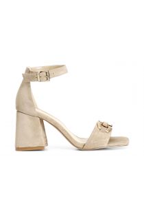 Suede sandals with gold accessory. reinforced heel in the back with adjustable buckle strap at the ankle. 70 mm-high heel.
