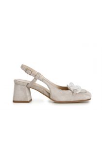 Suede shoes open at the back with a transparent satin-effect bit. 5 cm heel clad with the same leather