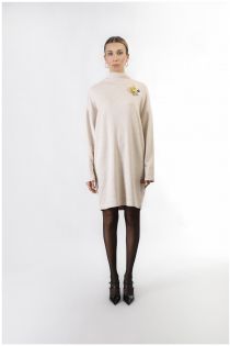 Warm-touch sweatshirt dress. high collar and flower application on the front of the dress. side pockets. extremely comfortable functional and trendy garment.