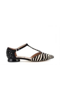 Suede and microfiber t-bar ballerinas with a zebra print and rhinestone heel. leather insole and 1.3 mm lacquered heel. a graphic glamorous design for a striking look.