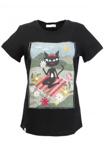 Short-sleeved t-shirt in stretch cotton jersey reproducing the print of the cute cat noir having a picnic on the lawn. the t-shirt is embellished with rhinestones.