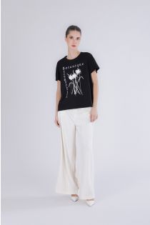 Women's short-sleeved kimono t-shirt with a relaxed fit made of stretch cotton jersey. floral appliques and jeweled chains on the front for an elegant and contemporary look. the model is 175 cm tall and wears a size s. comfort fit.