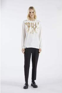 Viscose jersey T-shirt enriched with gold foil lettering and small gold studs
