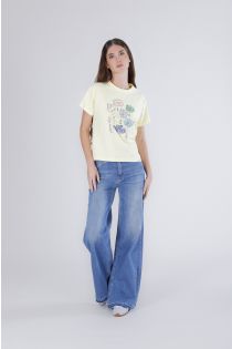 Women's stretch cotton jersey t-shirt with crew neck and short sleeves. regular fit for everyday comfort and style. front print with stylized flowers embellished with colorful sequins. models are 171 cm and 175 cm tall and wear size s. fit: regular.