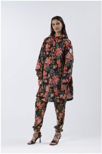 Rainproof anorak made of technical fabric in a floral printed version. the practicality of this article is that it can be placed completely inside a pouch at the back thus becoming a “clutch bag”.