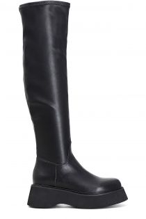 Thigh-high, imitation leather boots with monobloc sole. Rolled welt.