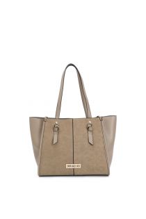 Tote in grainy material and suede effect on the front dial. handle attachment with knot on the sides and metal logo plate. zipper closure.