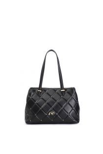 Tote with diamond quilt with matching rivet application and two-tone cafènoir logo. internal zip pocket. zipper closure.