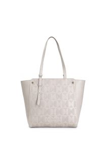 Rigid structured shopper bag with geometric pattern and embossed logo. single compartment and zipped inner pocket. adjustable handles. zip closure.