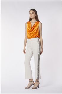 Trousers made of a fluid fabric and refined sequin edging at the hips enrich and embellish the garment making it perfect for a special evening.