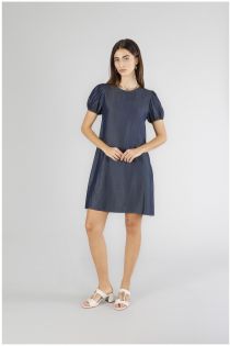 Tunic dress with short sleeves in tencel jeans fabric. buttoning on the back. an essential item to have in your wardrobe. to be combined with a sports shoe and a leather jacket for a more sporty look or for a unique and elegant look combine it with a sandal.