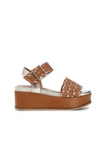 Two-material crossover sandals in leather and laminated leather on leather-clad platform and comfortable fussbett.