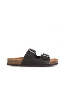 Two-strap leather slide on footbed.