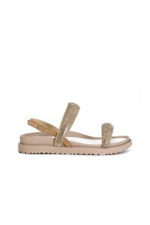 Fisherman sandals with two flat straps decorated with bright rhinestones. heel strap.