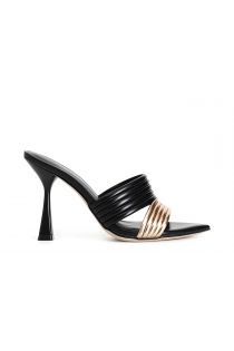 Two-tone slippers with padded straps. leather insole. with its slender shape this shoe will give you a touch of elegance and glamour. 90 mm-high reel heel.