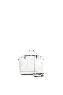Unlined mini bag with interlaced wide straps zip-top closure and handles with faux buckle attachment with optional shoulder strap.