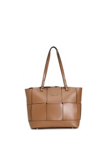 Unlined shopping bag with interlaced wide straps zip-top closure and handles with faux buckle attachment.