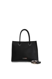 Unlined shopping bag with decorative contrast stitching tubular handles and logo plaque.