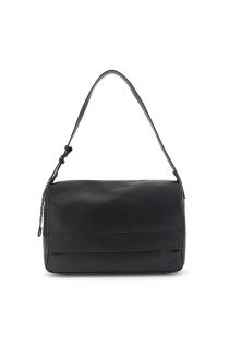 Unlined grained faux leather shoulder bag. Soft flap design, maxi metallic lettering on the handle, and large flat internal pocket.