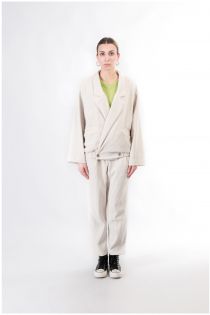 Oversized blouse with double-breasted buttoning on the bottom. made of rock velvet. elegant flower brooch applied on the lapel. to be combined with trousers in the same fabric.