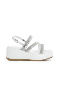 Asymmetric sandals with straps covered in micro-rhinestones. a comfortable wide wedge with a padded insole clad with napa leather.