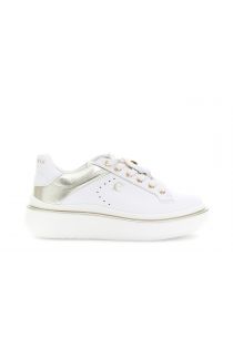 White leather sneaker with gold-plated inserts and a removable jeweled lace-up accessory. Fabric lining and leather insole. A 4 cm sole for a touch of glamour and everyday comfort.
