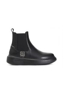 Women's ankle boot in covered leather with 30mm platform. shoe with a sporty look with elastic on the side of the shoe to make it easier to put on. side rhinestone insert. the insole is in leather internal footbed. round tip. sole height 40mm.