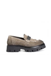 Suede moccasin with fringes and jewel accessory. the insole is in leather. the tank sole in extralight material streamlines the model and makes it hyper current.