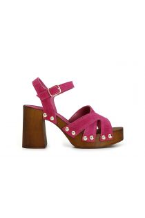 Clogs with high wooden heel and platform. suede weave and ankle strap