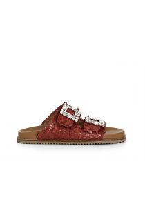 Woven leather slipper with double jewel buckle. lining and insole are in leather. comfortable 2.5 cm high fussbett.