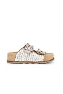 Woven leather slipper with double jewel buckle. lining and insole are in leather. comfortable 4.5 cm high fussbett.