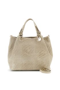 woven leather tote with metal charm and removable shoulder strap taupe