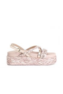 Asymmetrical colour block sandals in woven raffia with rhinestone insert. comfortable footbed and raffia-clad wedge.
