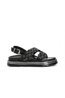 Asymmetrical sandals with rhinestone threading on the band. comfortable fussbett and patent insert visible on the sole. 40mm-high heel.