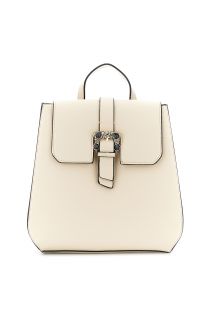 Faux leather backpack with a flap, contrasting ribbed details, and a jeweled buckle on the front. Elegant and practical, perfect for urban chic looks.