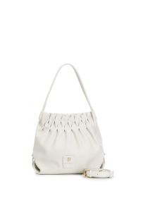 Softly pleated hobo bag with smock stitch detailing and attached tag. zip closure. bag with shoulder strap.