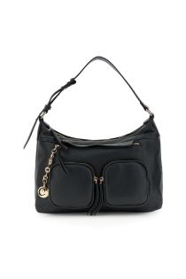 Bag with front pockets and personalized metal charm. single compartment and internal zip pocket. zipper closure.