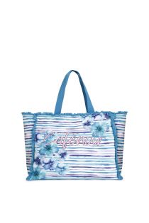 Beach bag in printed fabric with decorative fringes contrasting ribbon handles and plain internal lining. practical and light perfect for your summer days.