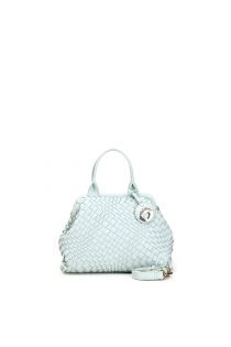 Snap closure bowling bag embellished by irregular sized crossover feature and tubular handles. Custom pendant accessory
