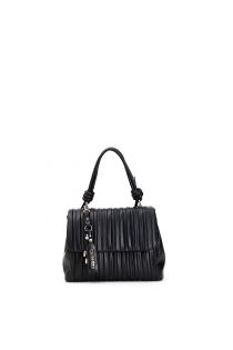 Satchel in soft material with characteristic wavy pleating and knotted handles with contrasting colour embellished by Cafènoir pendant accessory