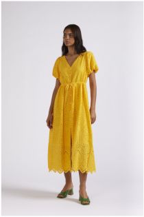 Delicate chemisier-type dress in eyelet fabric. short balloon sleeves and drawstring waist. dress with a romantic and feminine style.