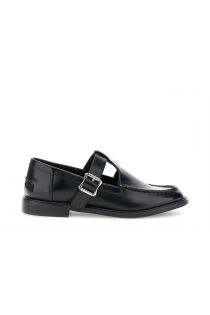 Brushed faux leather loafers with a strap. Modern design with a side buckle, leather insole, and a low 2 cm heel. Minimalist elegance.