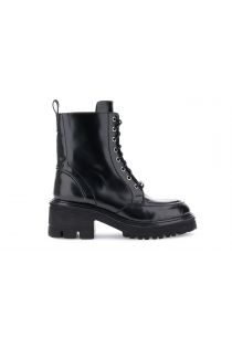 Lace-up ankle boots in black brushed leather with a metal accessory and a lug sole. They have a 5.5 cm heel and a 2.5 cm platform. Leather lining. Bold and feminine, perfect for urban chic looks.
