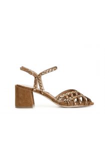 Microfibre and rhinestone triangular cage sandals. ankle strap and 60mm-high heel
