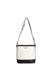 Bucket bag in natural canvas contrasting profiles. logos in plastic material and adjustable shoulder strap. open back pocket and enamelled logo rivets.