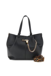 Grainy leather-effect shopping bag with logo chain and padlock. Removable animalier ribbon shoulder strap for a bold, ultra-feminine look.