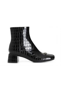 Ankle boot with rounded toe in crocodile print effect with personalized accessory. zipper on the inside of the shoe. 45 mm high banded heel. the insole is in leather. ideal in combination with multiple looks from morning to evening.