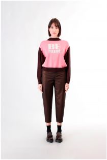 Cropped sweater with biker collar in warm and soft wool blend yarn. stockinette stitch and jacquard workmanship for our "be noir" slogan embellished with expertly applied rhinestones. available in a very trendy two-tone variant and two solid color variants.