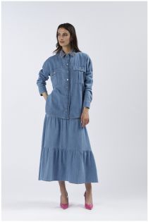 Straight shirt with patch pockets with long sleeves made of comfort denim. the collar is embellished with an exclusive rich embroidery of multi-coloured rhinestones.